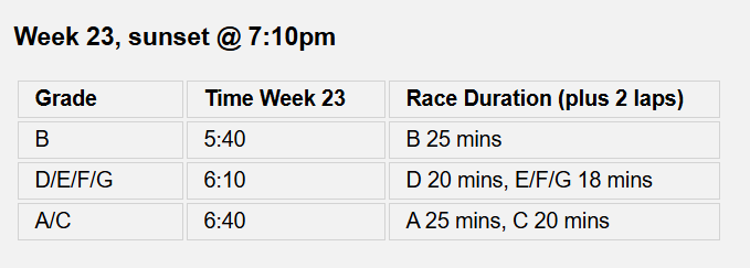 Please remember to check the RMS Calendar for race times each week now that we are back to rotating all 3 time slots.